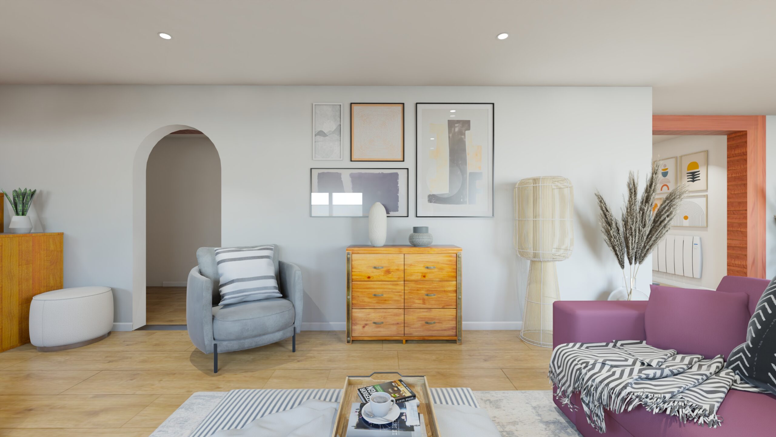 Délimiter, agencer et décorer chaque espace dans des teintes lumineuses et en conservant le mobilier existant (canapé dans un nuancier de violet, consoles, meubles salon, bureau, salle à manger….) !