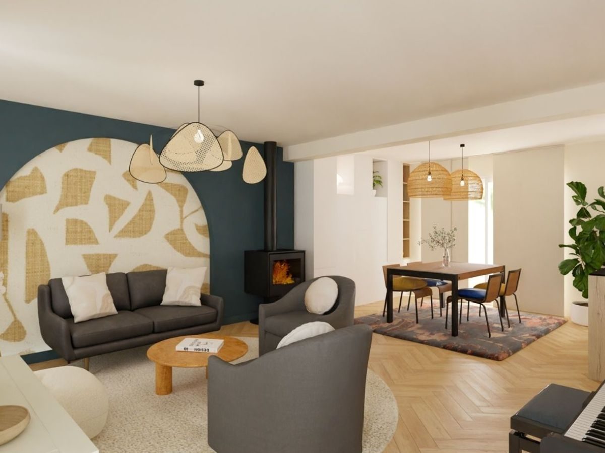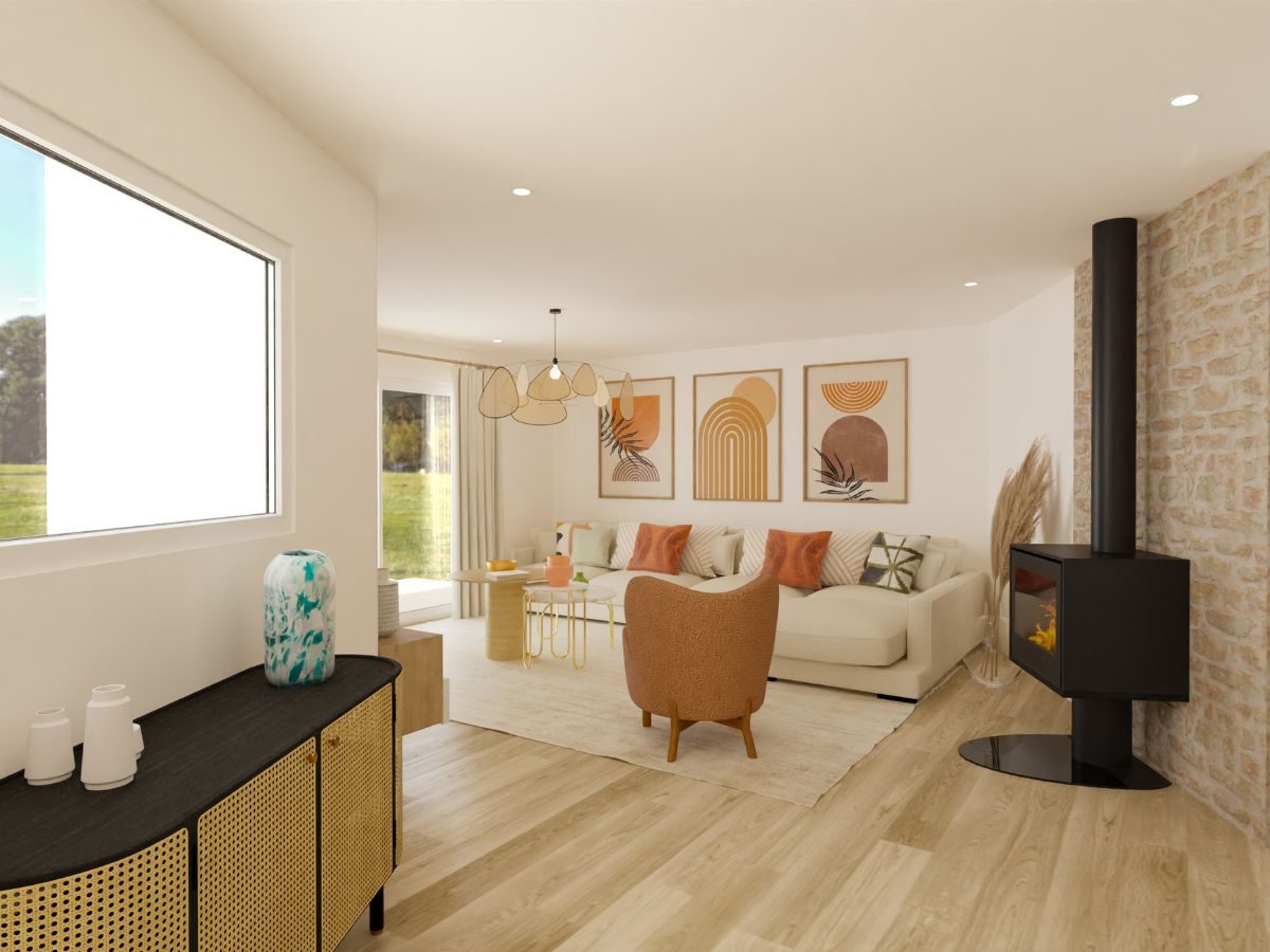 Conception, agencement et décoration d’un espace entrée, salon, séjour et salle à manger, surface totale d’environ 45m² dans une maison située à Saint-Thurial en Ille-et-Vilaine.