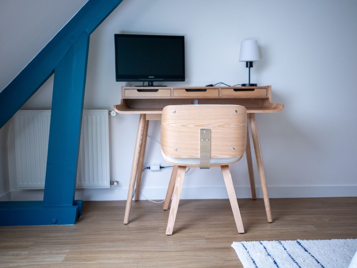 Un espace bureau agencé de manière à ce que toute la petite famille puisse l’utiliser , un pan de mur décoré en partie avec un papier peint panoramique de chez Isidore Leroy !