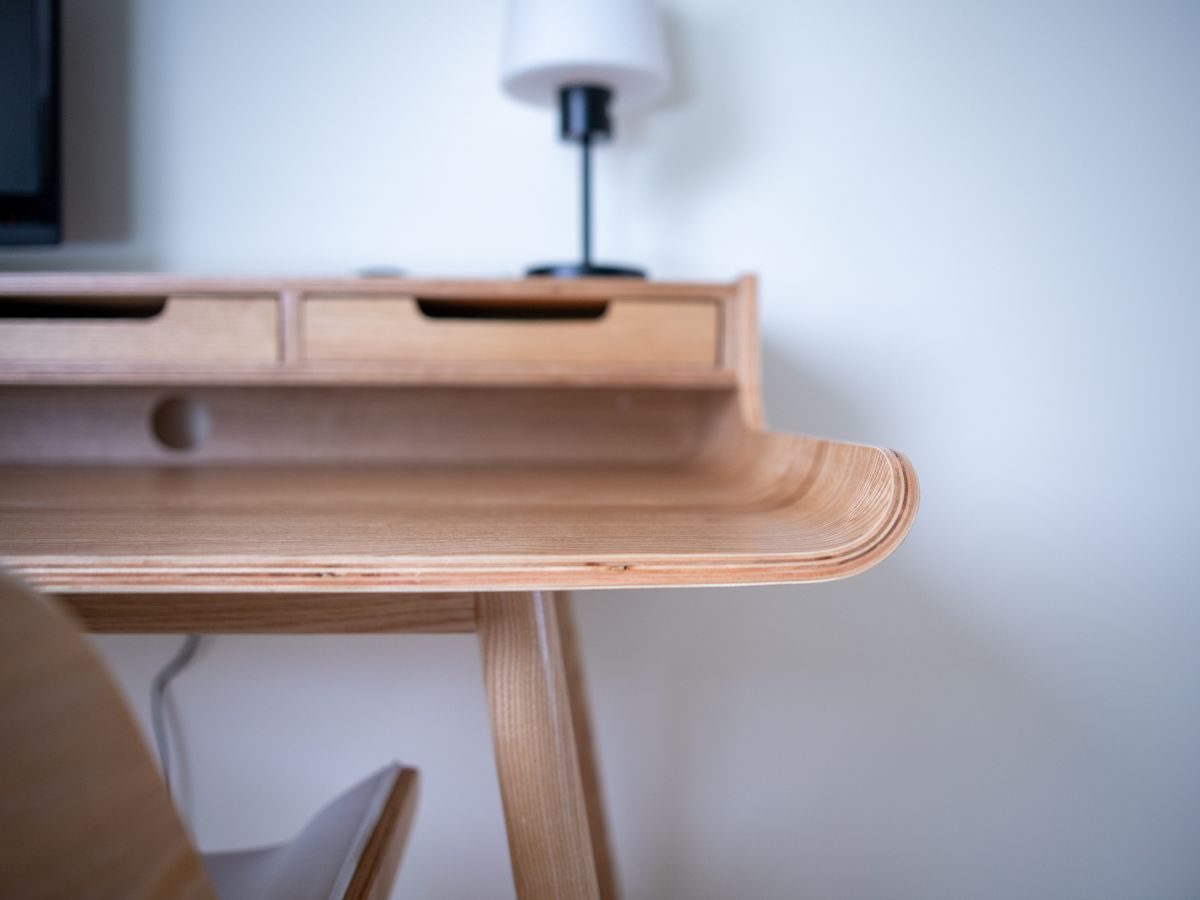 Un espace bureau dans une teinte lumineuse dans un nuancier de blanc pur, création d’un bureau d’angle (Panneau tasseaux bois chêne clair naturel ), et agencement sur un des pans de mur sur fond vert Beverly de chez Farrow & Ball Objectif : création d’un meuble design/déco et de rangement !