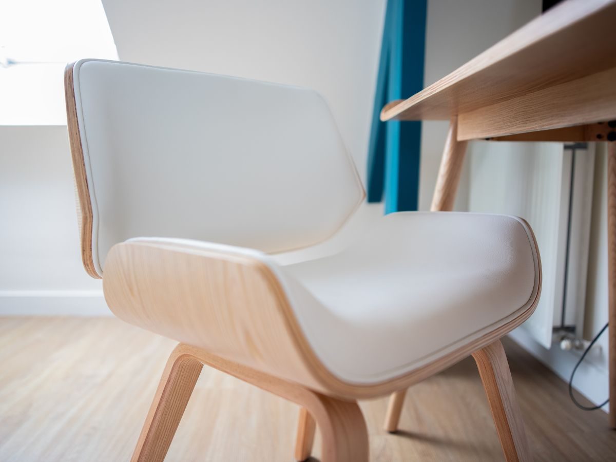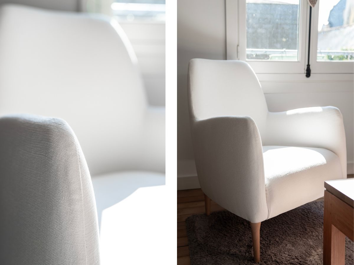 Un espace salon très lumineux avec des petites touches de couleurs sur le fauteuil pivotant ainsi que le textile !