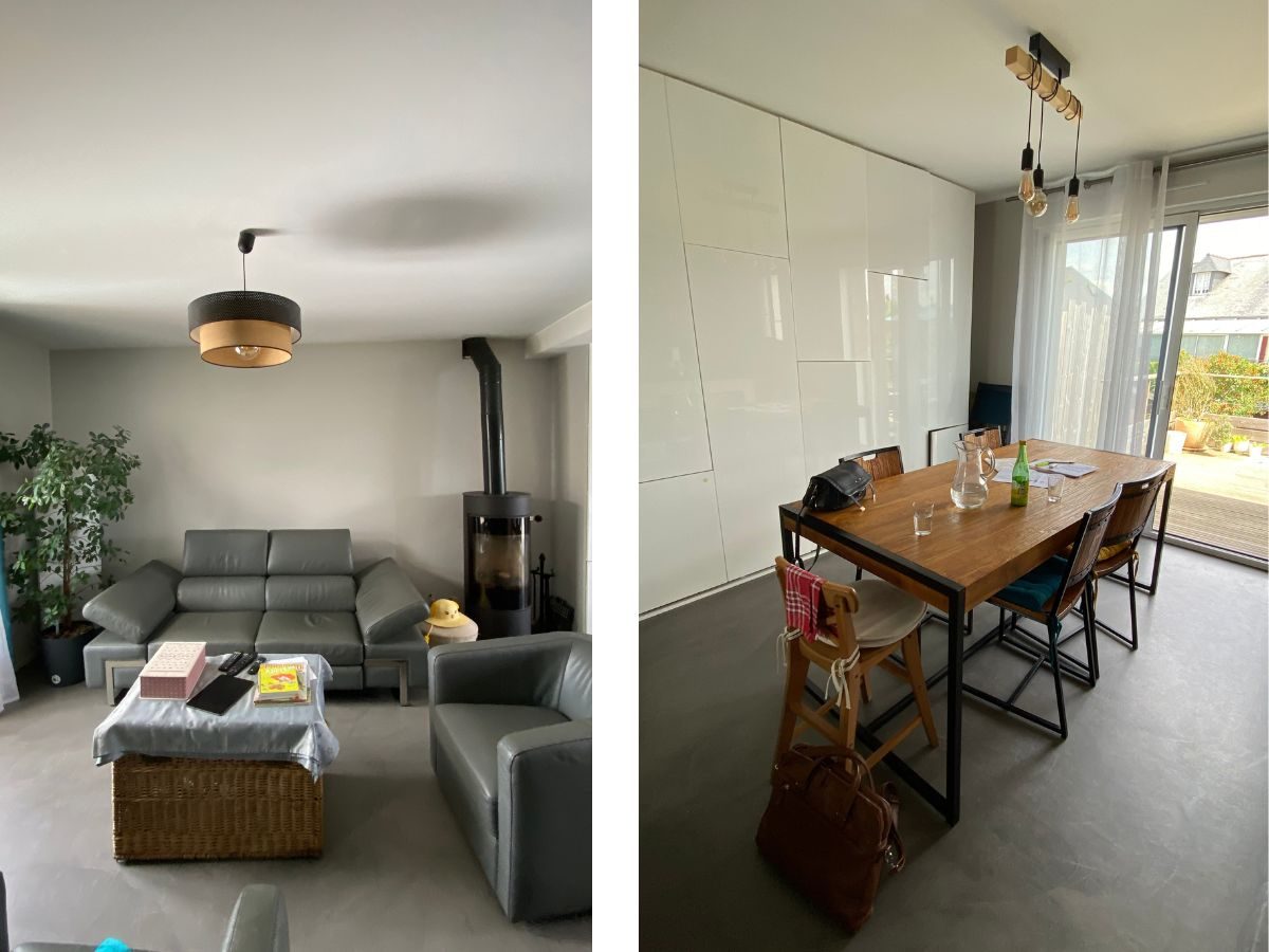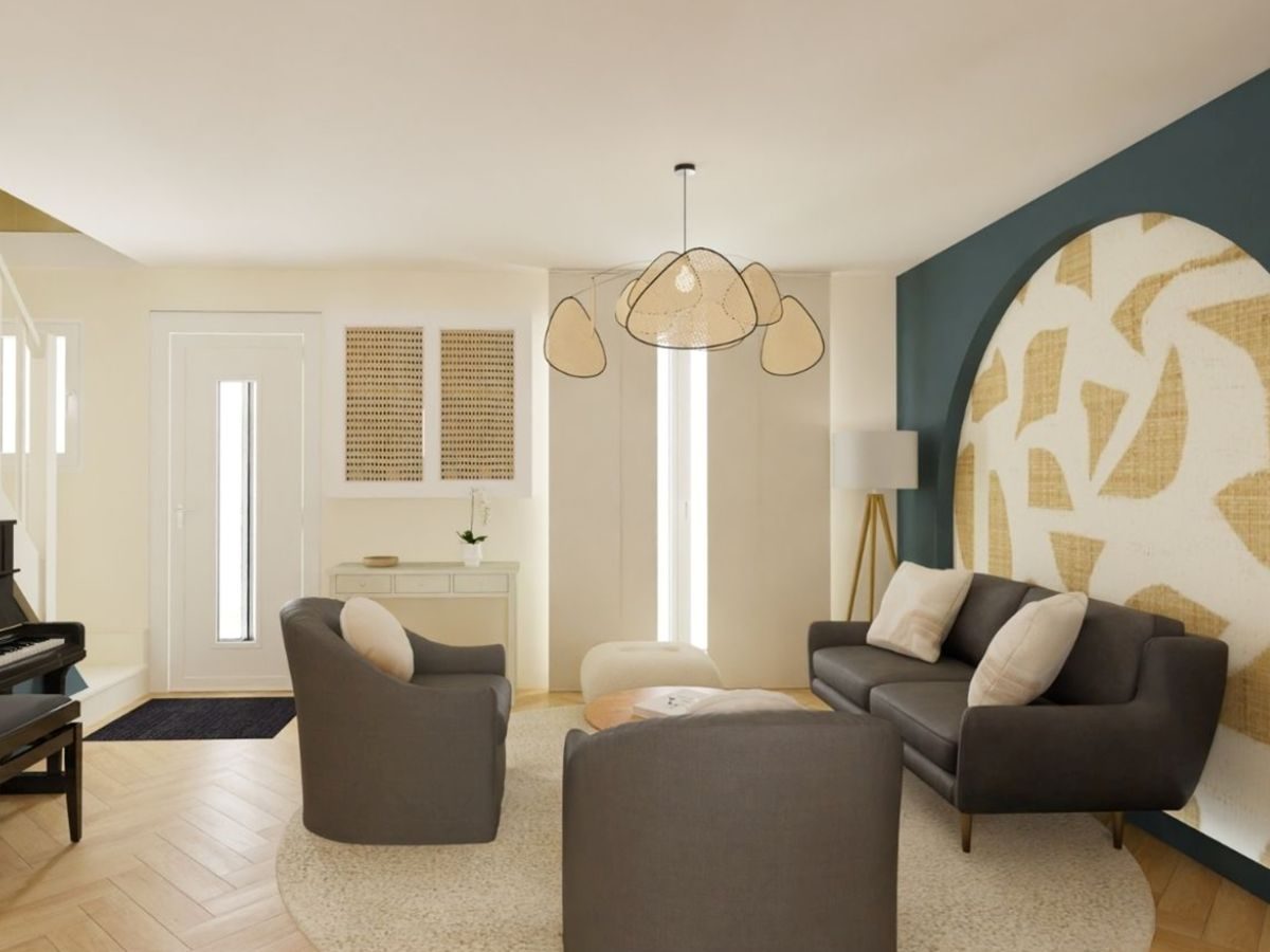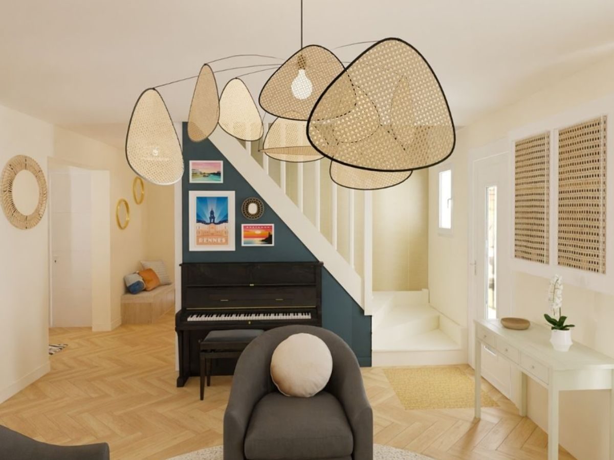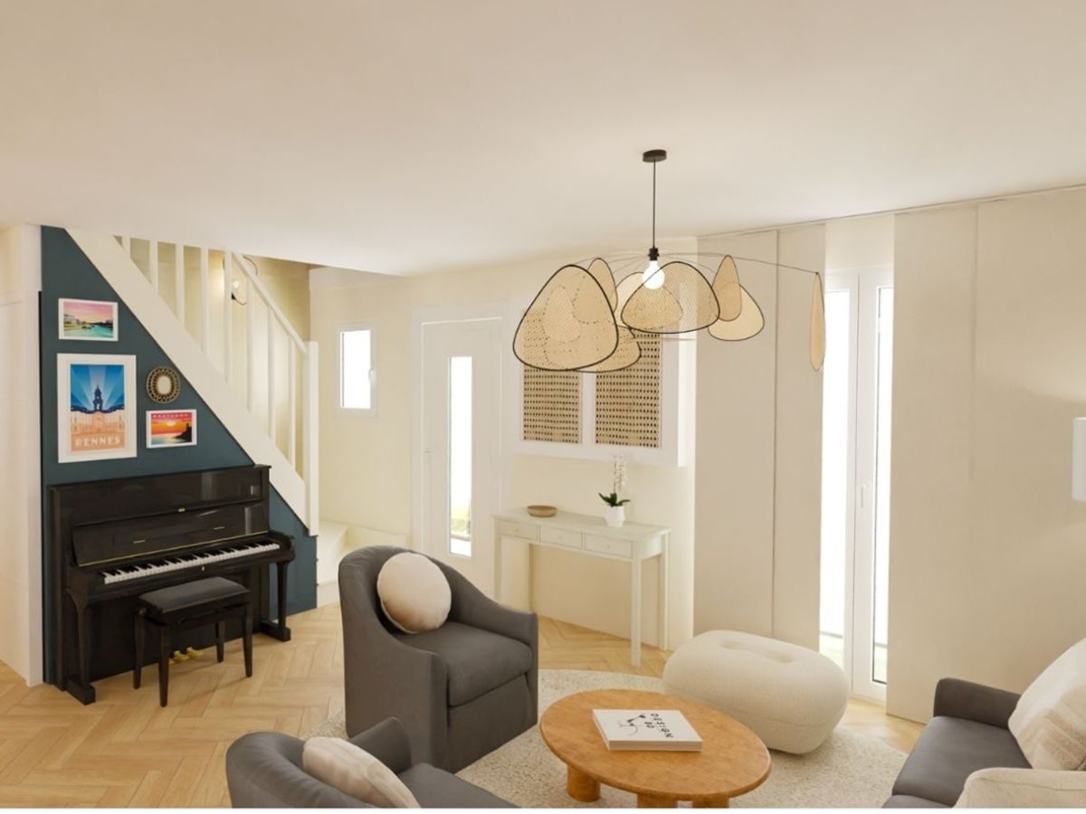 Projet de décoration d’un espace entrée, cage d’escalier, salon-séjour, cuisine dans une maison située à Betton (35), une surface totale d’environ 40m².
