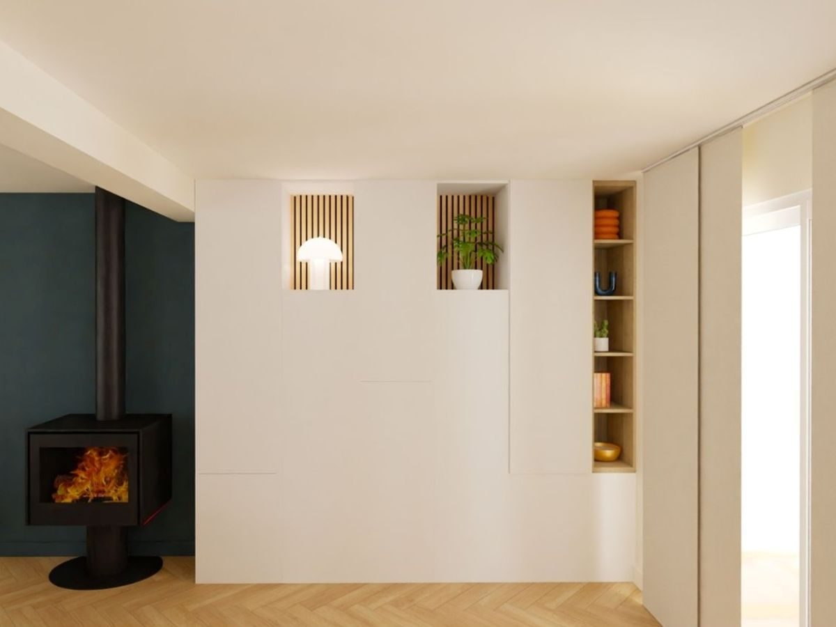 Création d’un espace penderie dans l’entrée, d’un meuble en enfilade avec insert cheminée dans un design moderne et fonctionnel !