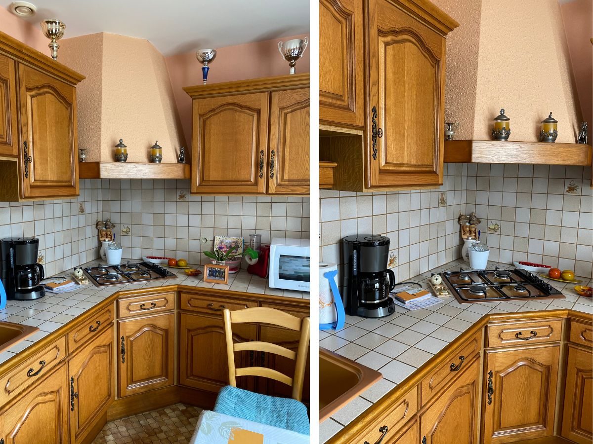 Un espace cuisine très sobre dans une teinte lumineuse avec rappel de bois sur les plans de travail afin d’y apporter du naturel et de la chaleur ! Le sol une partie en lame PVC imitation carreaux de ciment du côté d’un linéaire de la cuisine ! Des luminaires suspendus en verre légèrement teintés orangés, des assises tabourets dans une matière tissus bouclette adaptés pour les espaces telle que la cuisine !