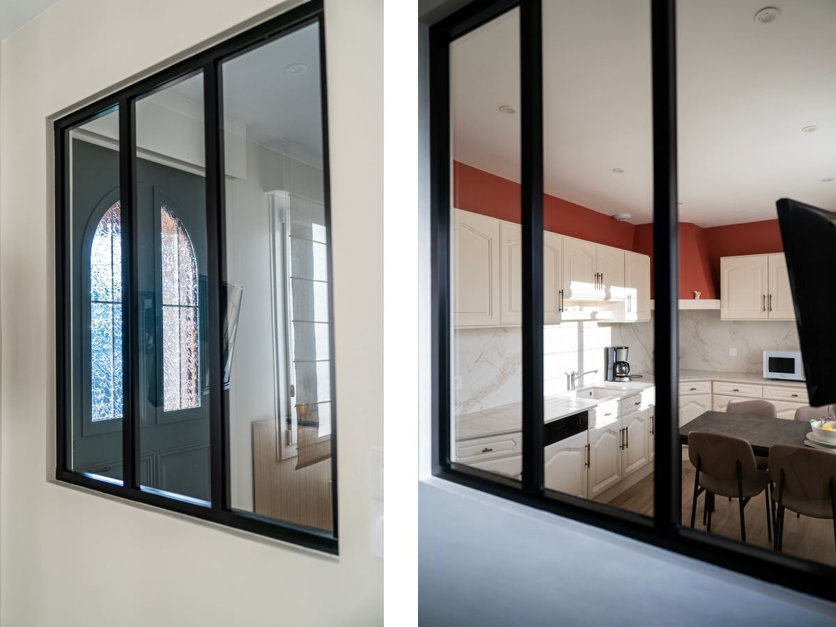Dans un style épuré & lumineux , création de verrière type industriel espace cuisine et panneaux claustras entrée , d’un meuble TV design ainsi que l’agencement et la décoration des espaces escalier, salle à manger, séjour, cuisine et salon !