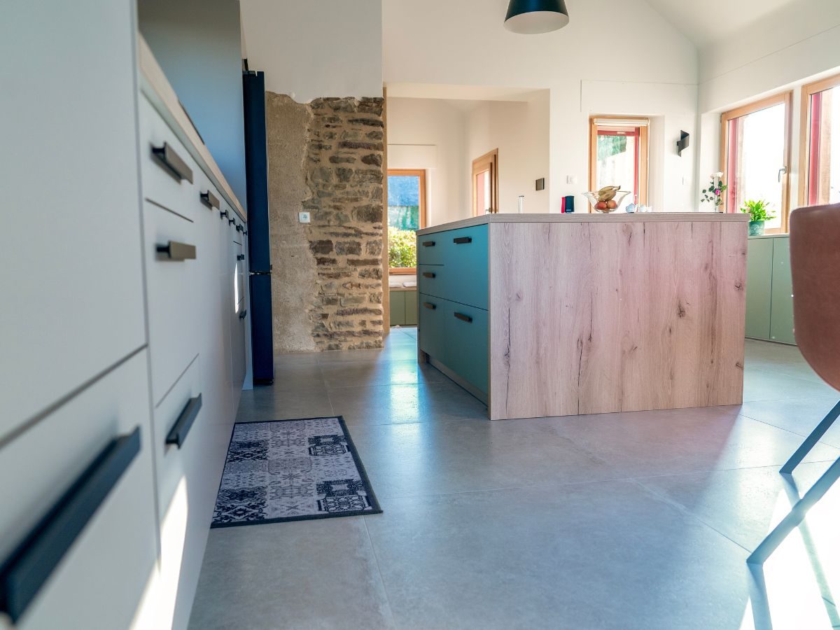 Conception, agencement et décoration d’un espace entrée, cuisine & salle à manger, séjour – salon et bureau , surface totale d’environ 80m² dans une maison avec extension située à Argentré en Ille-et-Vilaine.